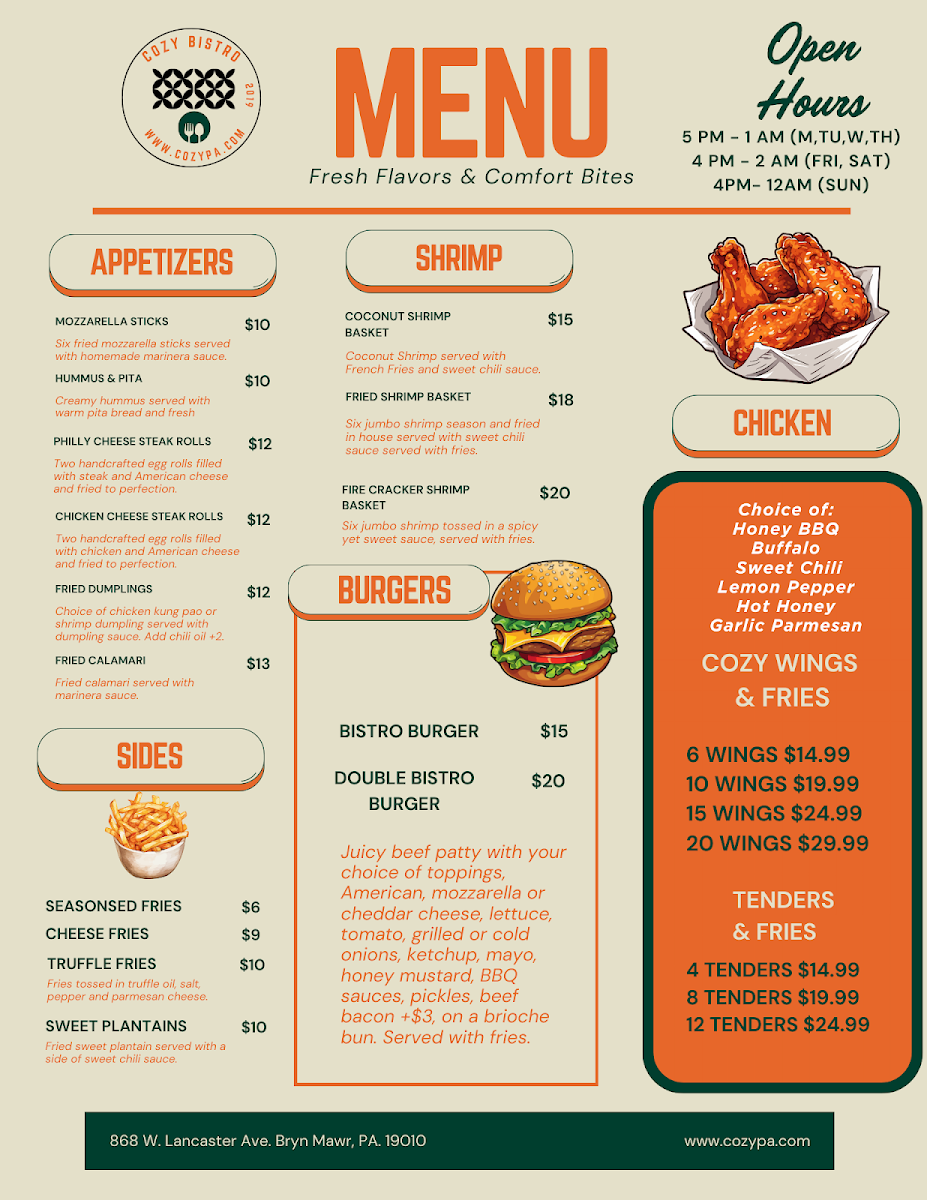 Whether you're unwinding after a long day or kicking off your weekend, Cozy Lounge is the go-to destination for great food, excellent hookah, and warm service. Join the lively community of satisfied diners and make Cozy Lounge your new favorite spot!